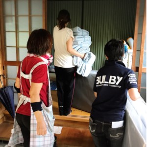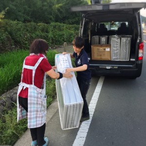 寝床環境は、フローリングに薄い絨毯、薄い簡易マットが1枚と座布団という状況でした。車は路肩に寄せて、みんなでマットレスと敷きパッドを運びました。お母さんからは「このマットレスはレンタルですか?汚さないように使います。」と、避難生活での寝床に苦労されている事が伺えました。もちろん「自宅に帰る時も持ち帰りずっと好きなように使って下さいっ」と伝えました。このマットレスでご自宅の片付けと避難生活の中で少しでも安らぎの時間になりますようにっ☆