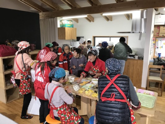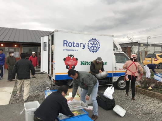 人吉ロータリークラブのキッチンカーが登場!とっても美味しい手作りお弁当を住民さんに振舞われました。馬水東道仮設の住民さんも協力して仮設間交流にもなっています。